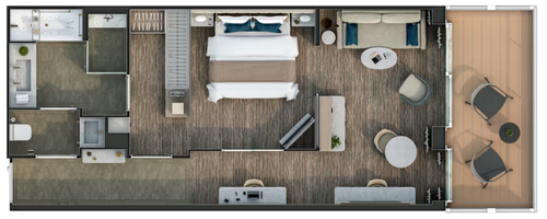 With features similar to our best-selling Medallion Suite, the Premium Medallion enjoys an optimal location at the aft. The Medallion Suite design builds on the phenomenal success of our iconic Veranda Suite, offering the comfort of a generous interior and balcony (527 sq ft and 86 sq ft, respectively). Additionally, the suite features a large bathroom with a double vanity, a spacious bathtub, and a separate shower, as well as a secluded bedroom area with a queen-size bed.