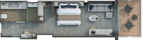 The Otium Suite is one of our newest and finest suites. Located in the premium aft corner position, the Otium Suite has a total size of 1,324 sq ft, including a 431 sq ft balcony, and comes complete with a whirlpool. Features include a spacious living room area, a luxurious walk-in closet, a separate large bedroom, and a bathroom with a whirlpool bath and walk-in shower. The crowning glory of the Otium Suite, however, is surely its phenomenal 270-degree view, giving you some of the best possible views of your destination.\