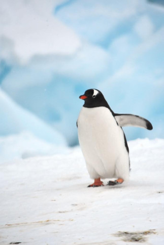 The snowbanks, measuring about 15 feet high, came the whole way down to water. So, the expedition team needed to carve out steps up the bank and then stomp out a trail with snowshoes in the deep snow. This allowed us access to several groups of the Gentoo colony. There was a large group down nearer the edge and then several groups higher up on the hills.