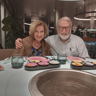 The other rather unique eatery aboard is Gunbae, a Korean BBQ place up on Deck 15 at the back of the ship. If you want to try something that may be new to you, try this! You are served about 20 different Korean dishes - everything from seaweed chips to grilled marinade Kobe beef. This is a restaurant with a first-at-sea feature - a grill in the middle of each table. That's right, the vegetables (two kinds of mushrooms, zucchini, etc), seafood (including shrimp, squid and octopus) and the meat (including chicken, bacon, and beef) were all grilled in the middle of the table.